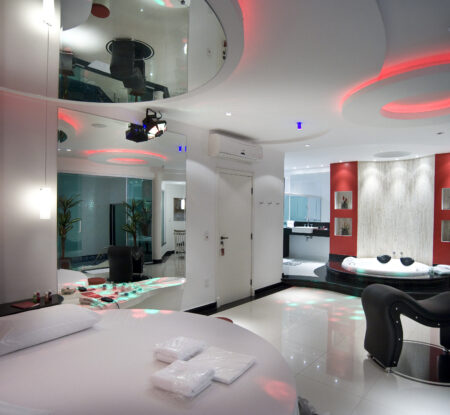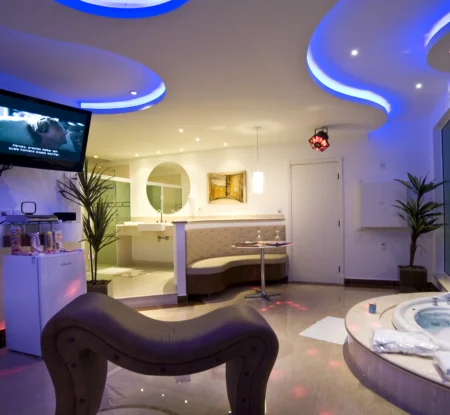 Smart TV 50”, Ar Condicionado Split, Cadeira Erótica, Color Light, Frigobar, Home Theater, Hidromassagem, Sauna, Pole Dance e Pista de Dança