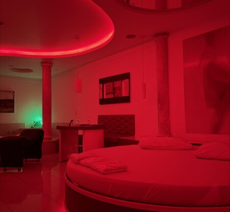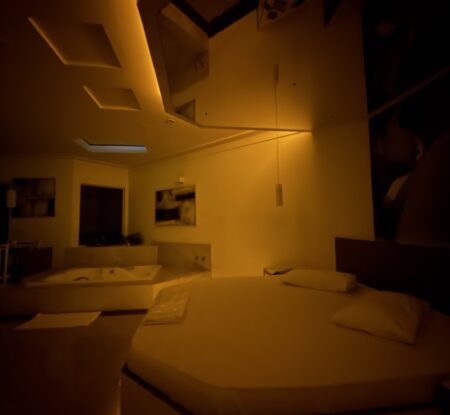Smart TV 50”, Ar Condicionado Split, Cadeira Erótica, Color Light, Frigobar, Caixa de Som Bluetooth, Hidromassagem e Decoração Erótica