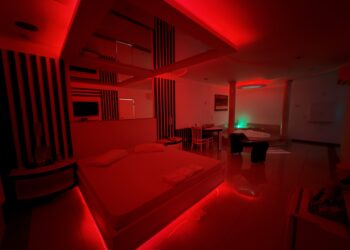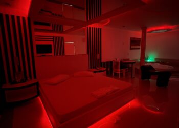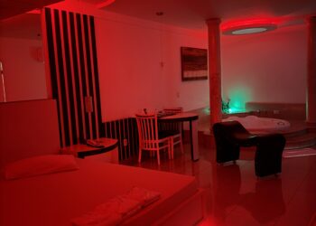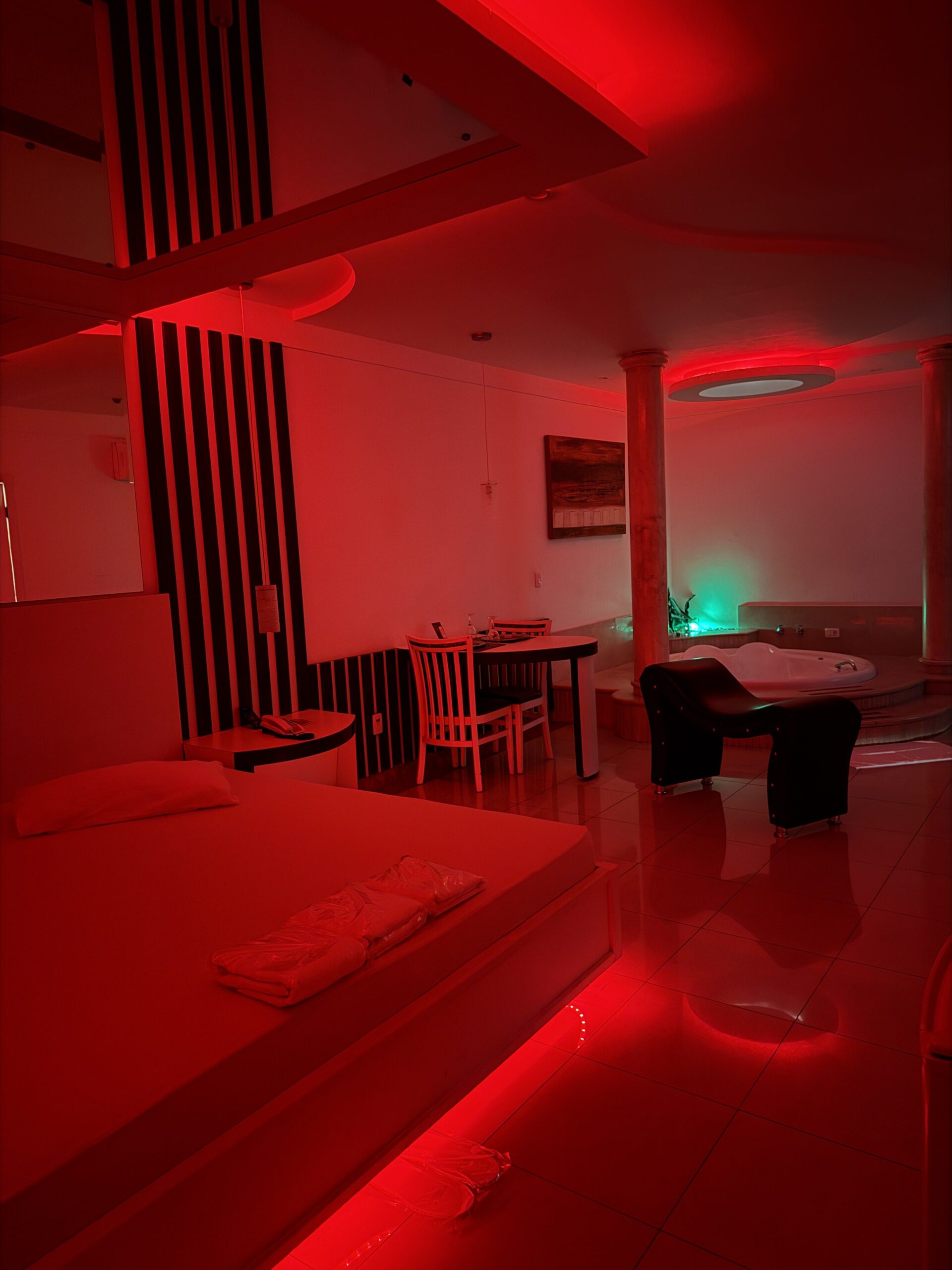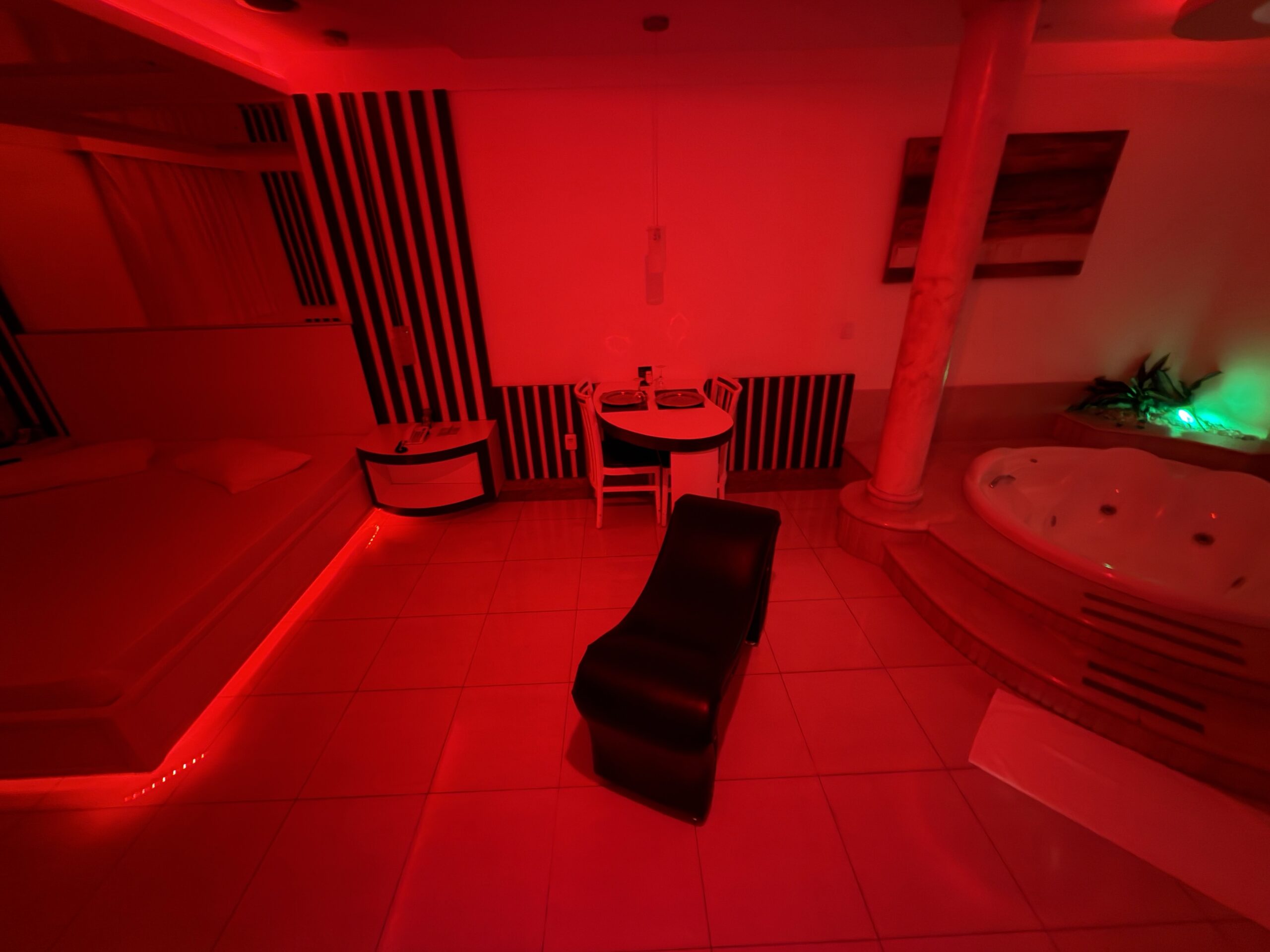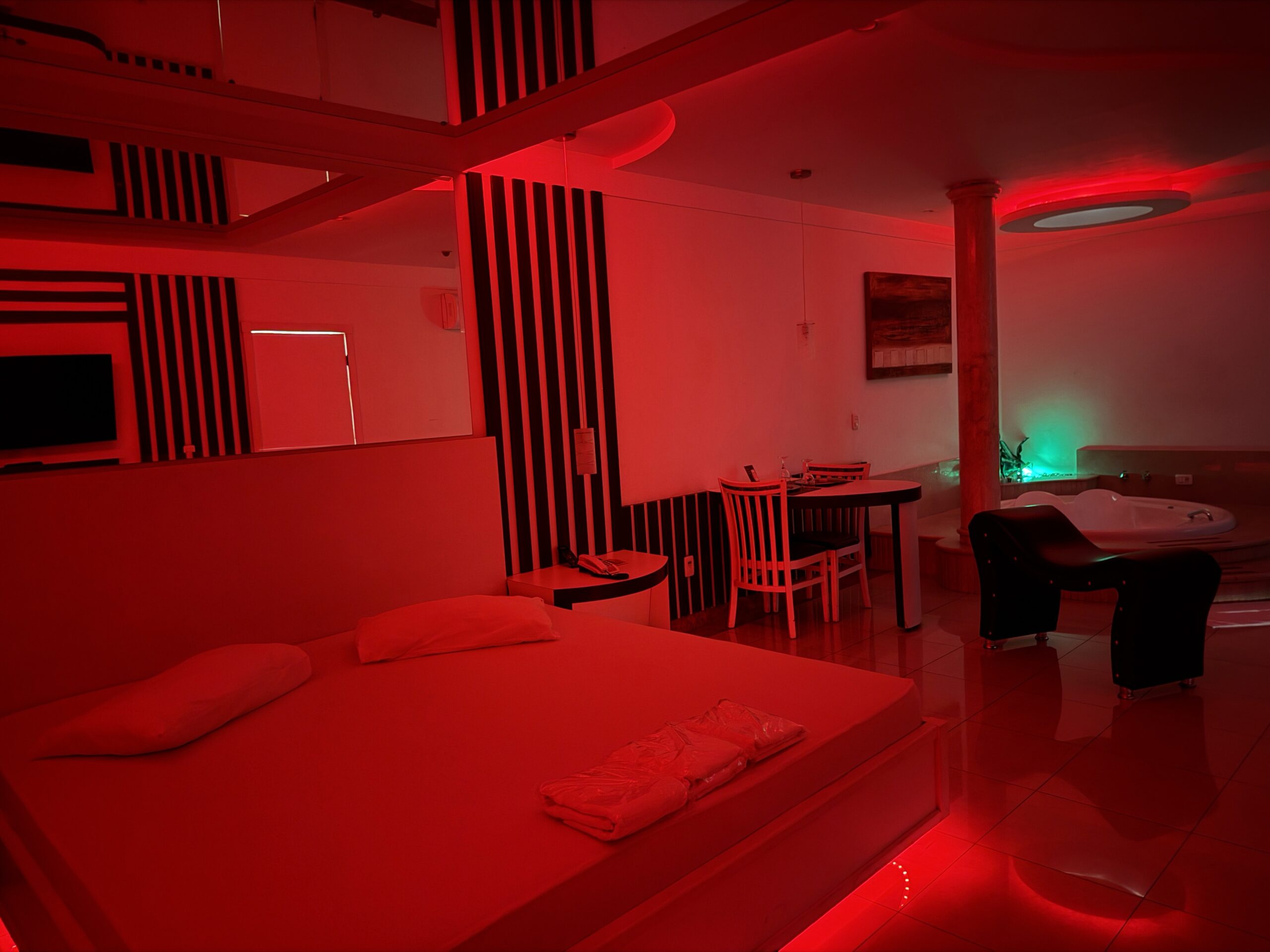 Smart TV 50”, Ar Condicionado Split, Cadeira Erótica, Color Light, Frigobar, Caixa de Som Bluetooth, Hidromassagem e Decoração Erótica