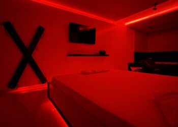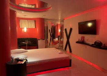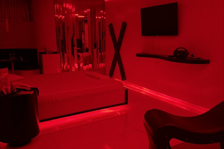 Smart TV 50”, Ar Condicionado Split, Cadeira Erótica, Color Light, Frigobar, Caixa de Som Bluetooth, Hidromassagem e Decoração Erótica