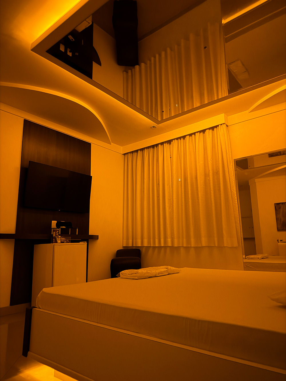 Smart TV 50”, Ar Condicionado Split, Cadeira Erótica, Color Light, Frigobar, Home Theater, Hidromassagem, Sauna, Pole Dance e Pista de Dança