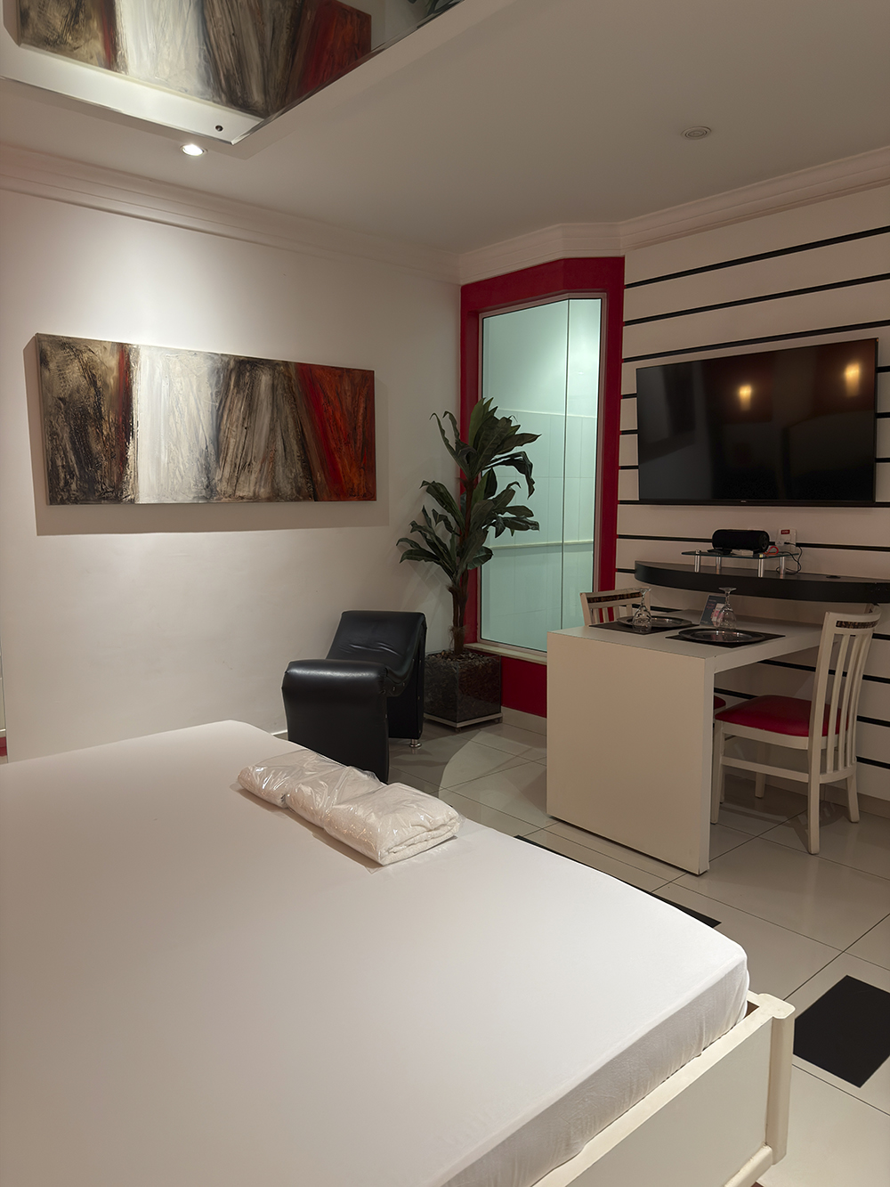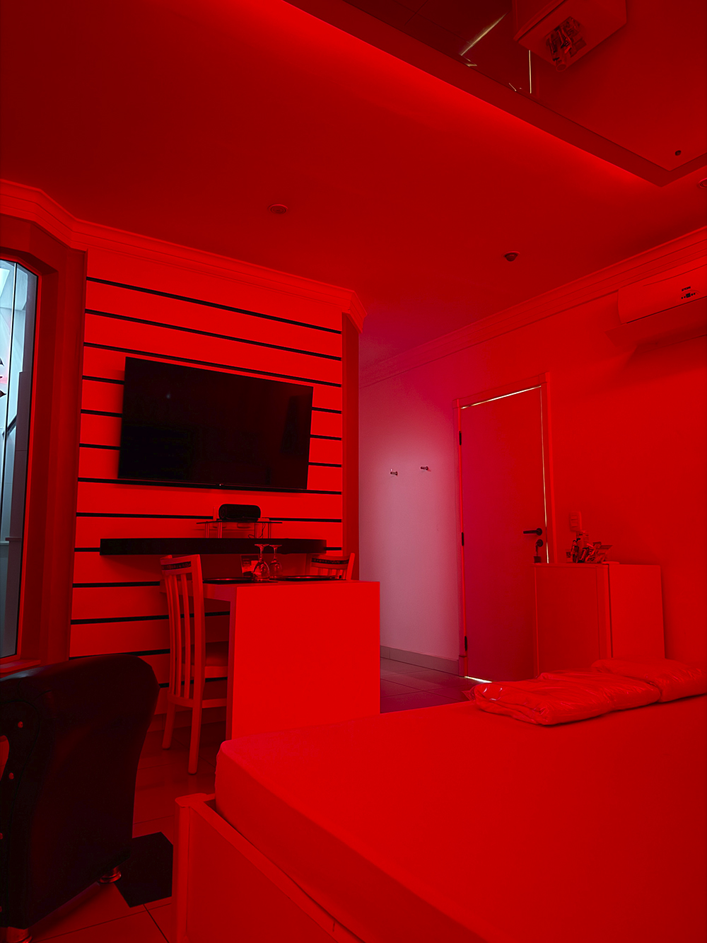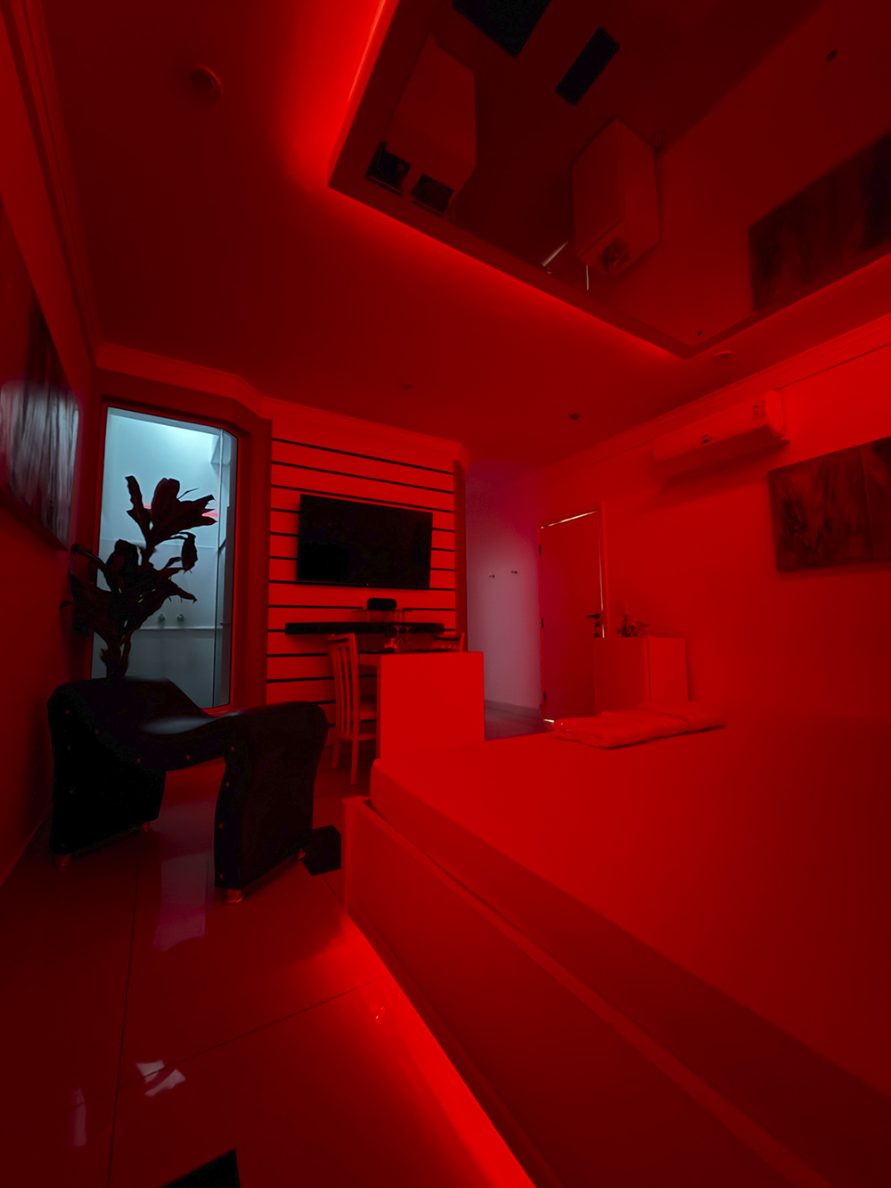 Smart TV 50”, Ar Condicionado Split, Cadeira Erótica, Color Light, Frigobar, Caixa de Som Bluetooth, Hidromassagem e Decoração Erótica