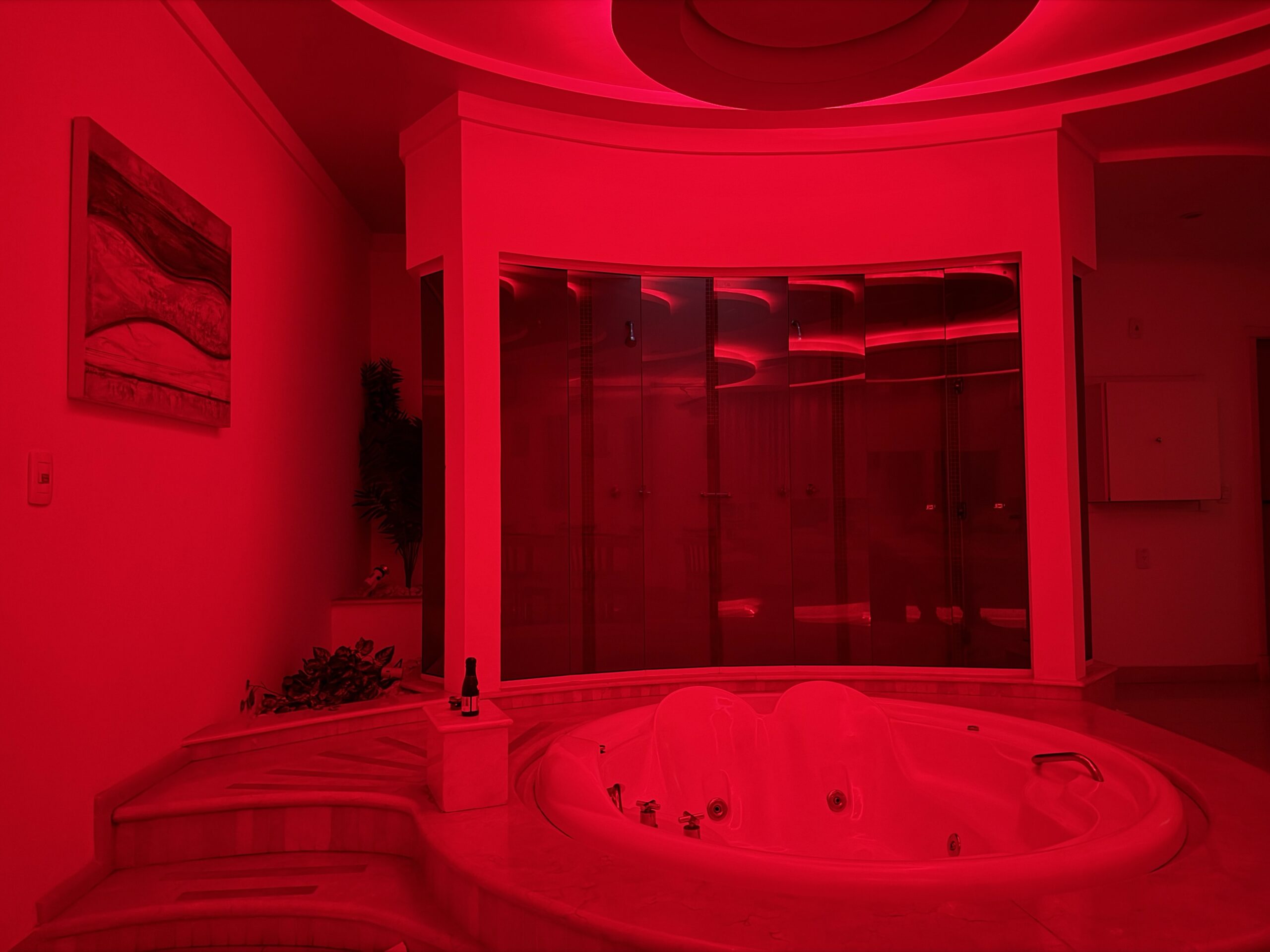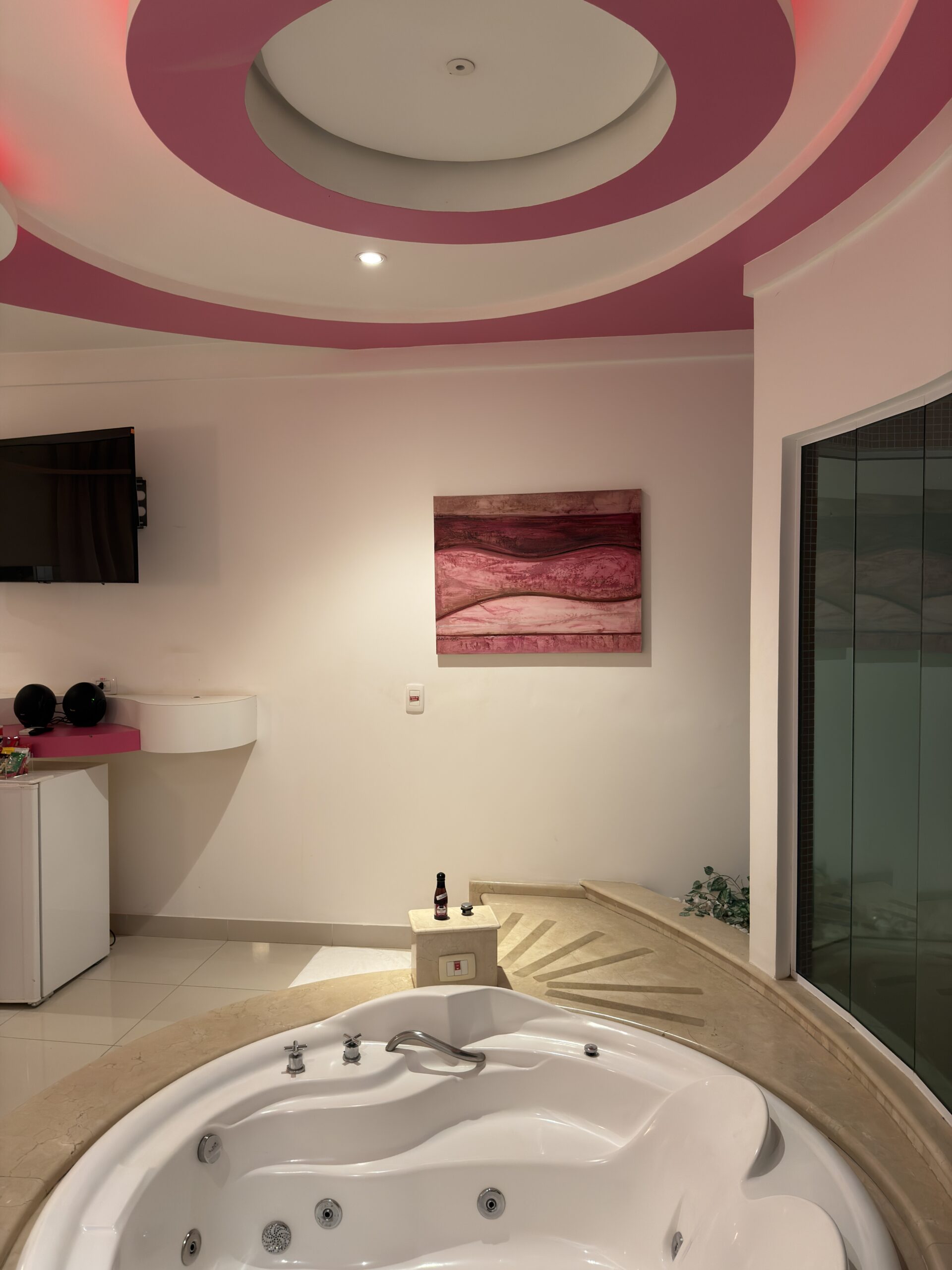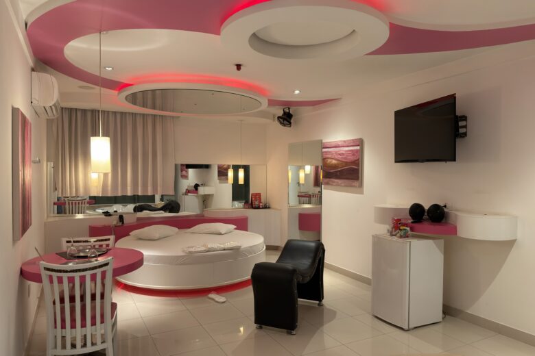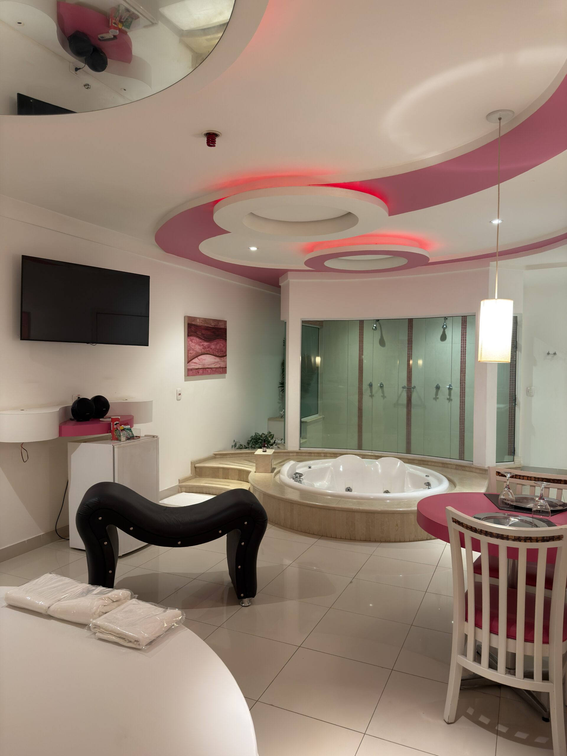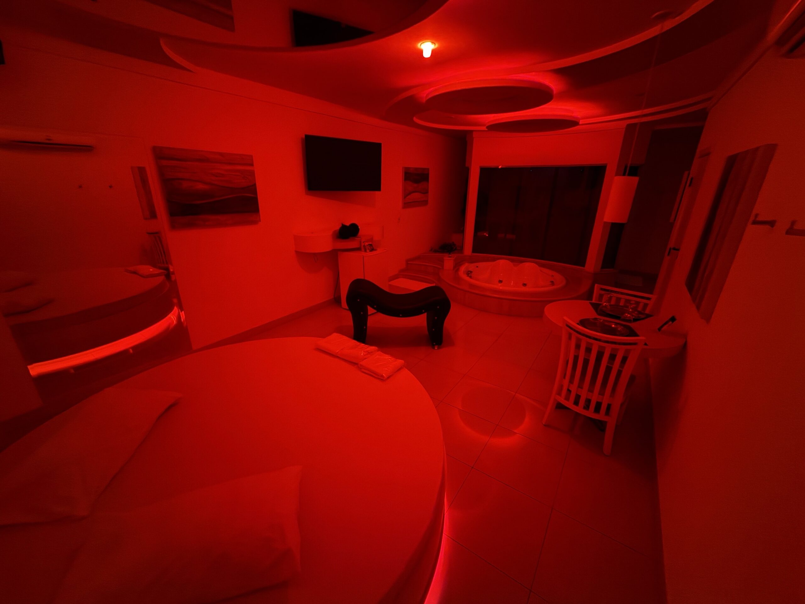 Smart TV 50”, Ar Condicionado Split, Cadeira Erótica, Color Light, Frigobar, Caixa de Som Bluetooth, Hidromassagem e Decoração Erótica