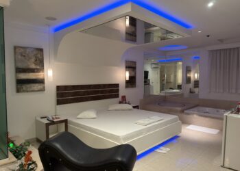 Smart TV 50”, Ar Condicionado Split, Cadeira Erótica, Color Light, Frigobar, Caixa de Som Bluetooth, Hidromassagem e Decoração Erótica