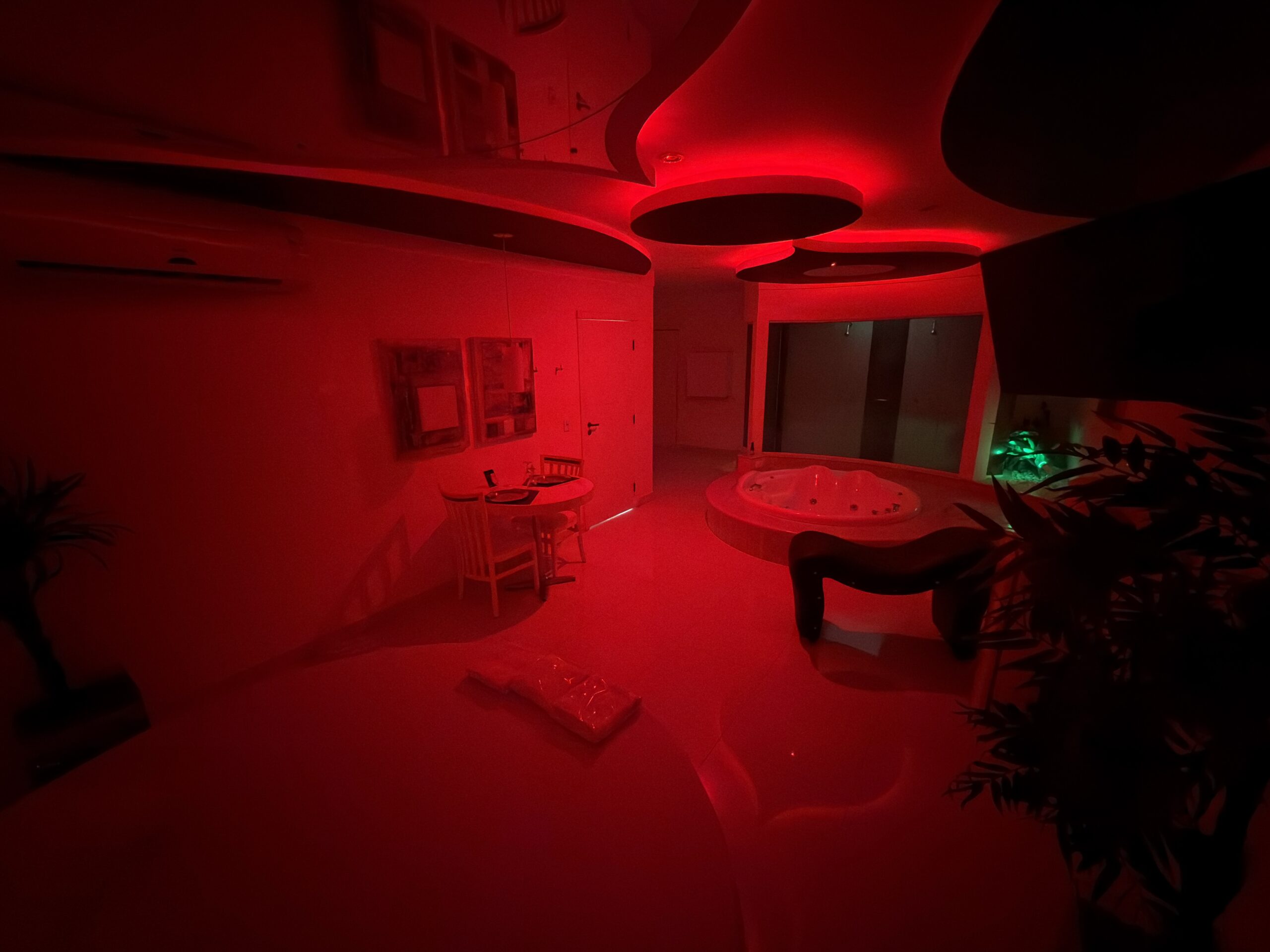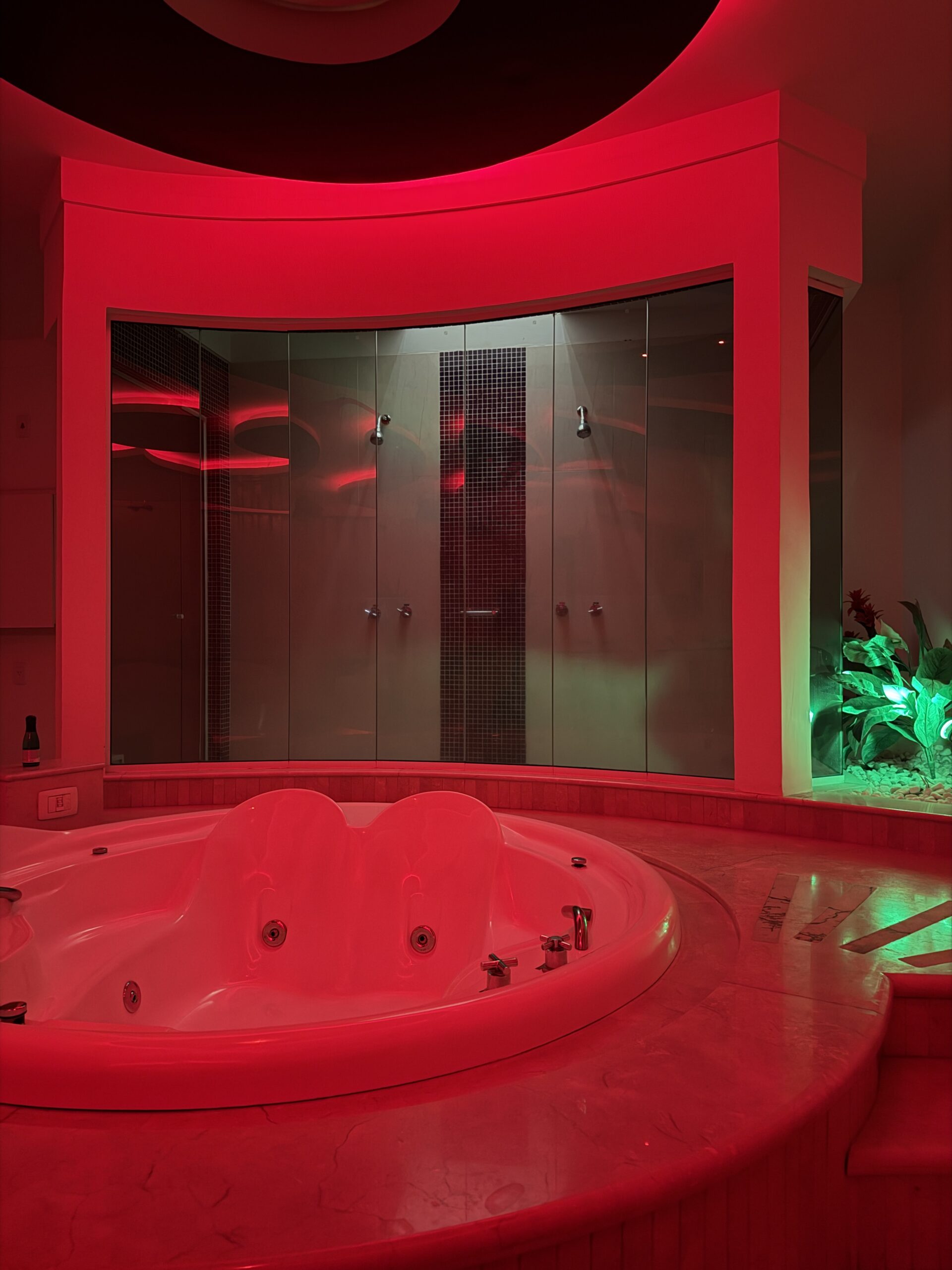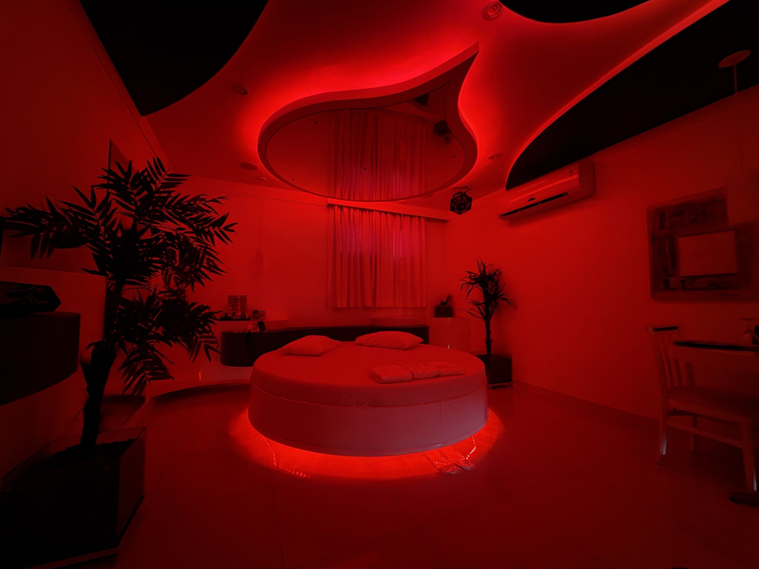 Smart TV 50”, Ar Condicionado Split, Cadeira Erótica, Color Light, Frigobar, Caixa de Som Bluetooth, Hidromassagem e Decoração Erótica