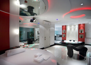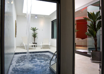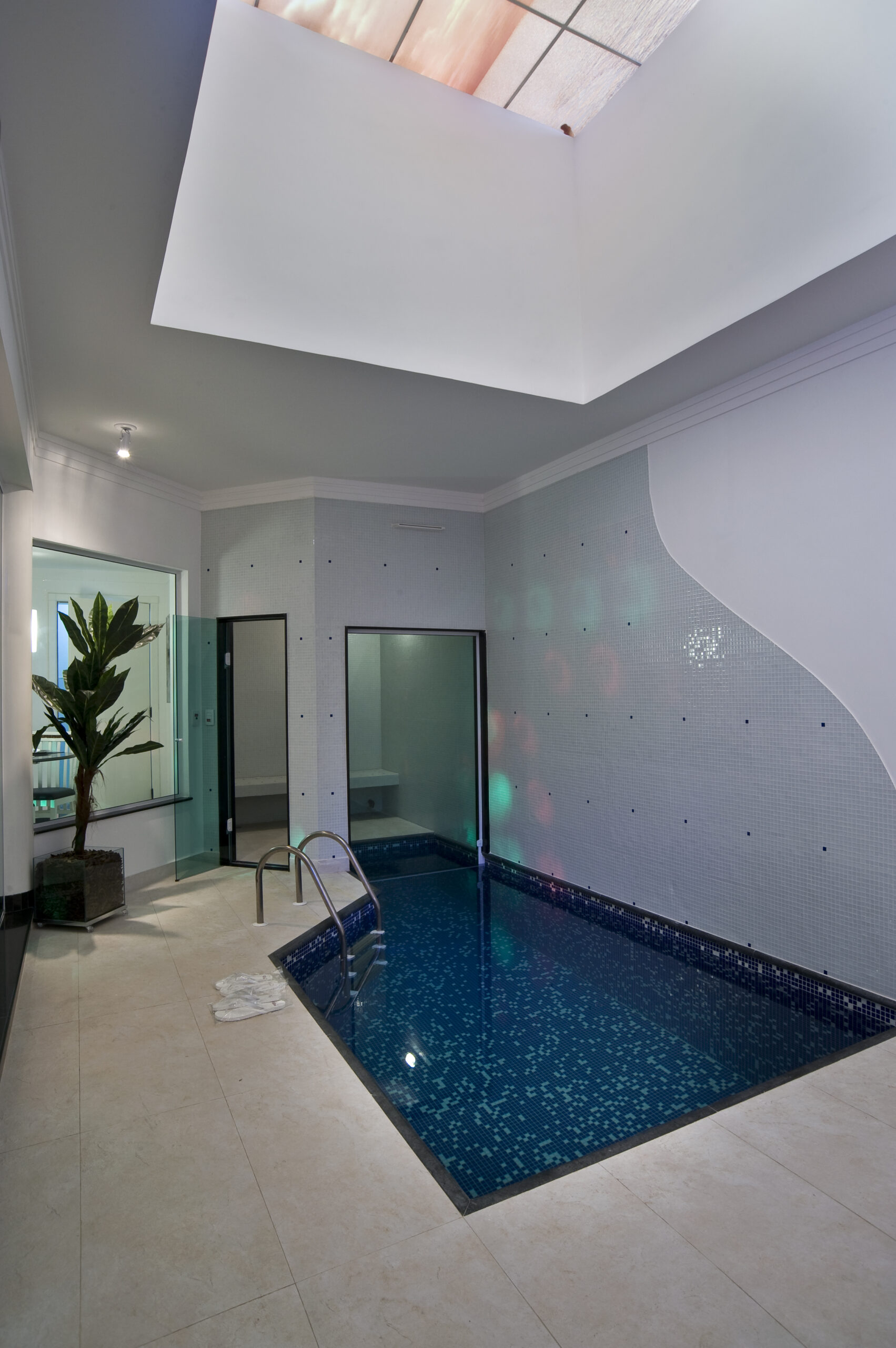 Piscina, Cascata, Teto Solar, Smart TV 50″, Ar Condicionado Split, Cadeira Erótica, Color Light, Frigobar, Home Theater, Hidromassagem, Sauna e Pista de Dança.