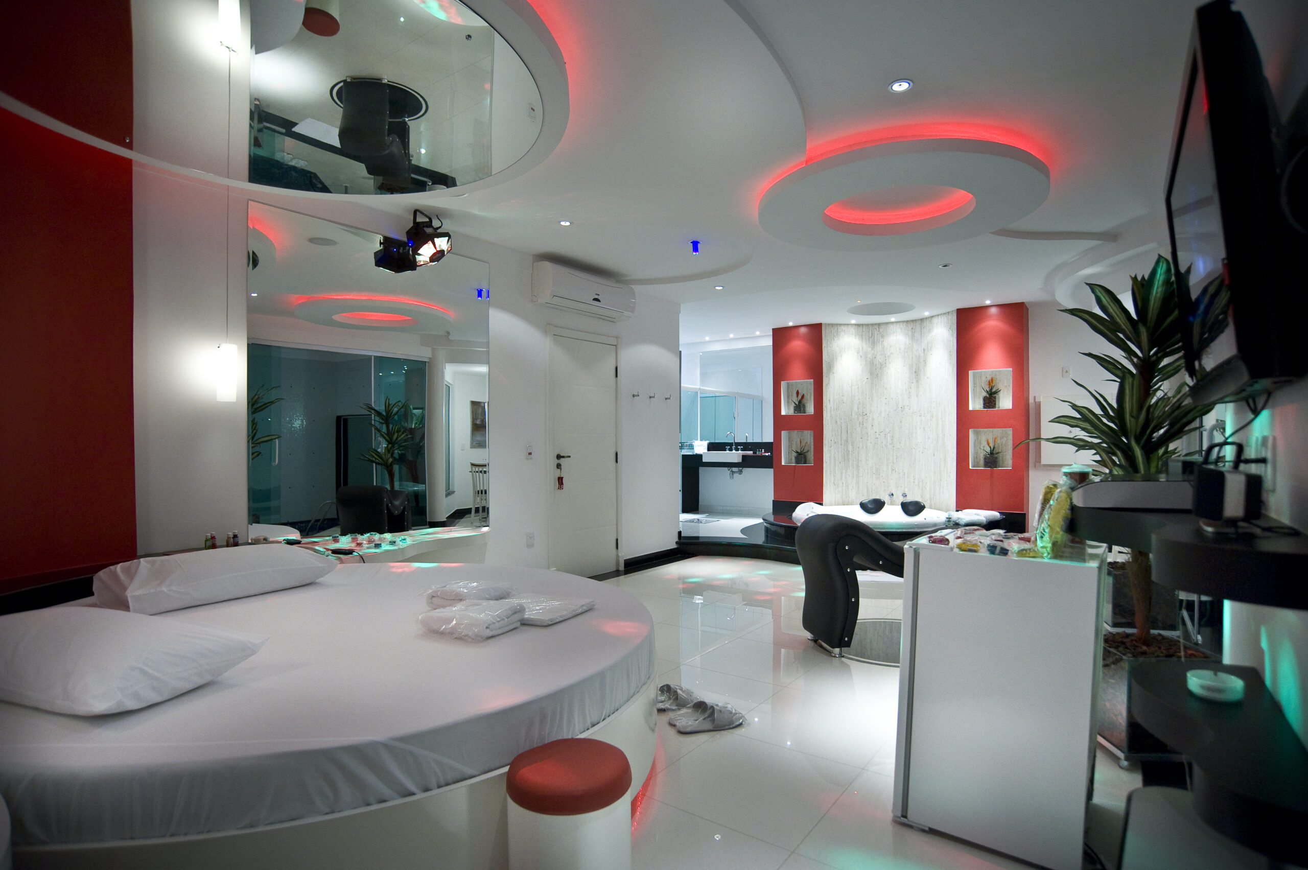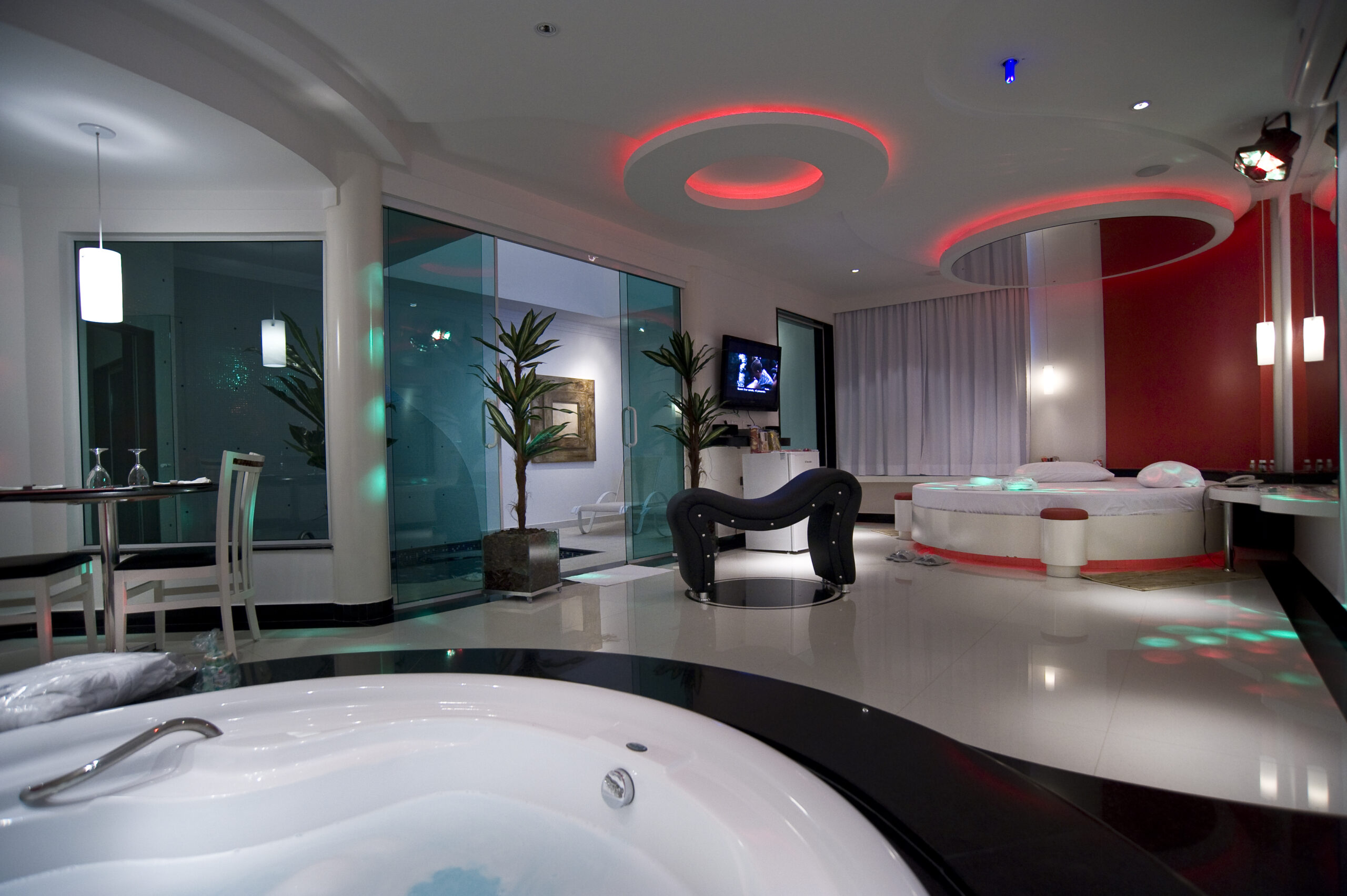 Smart TV 50”, Ar Condicionado Split, Cadeira Erótica, Color Light, Frigobar, Home Theater, Hidromassagem, Sauna, Pole Dance e Pista de Dança