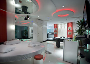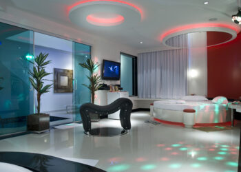 Smart TV 50”, Ar Condicionado Split, Cadeira Erótica, Color Light, Frigobar, Caixa de Som Bluetooth, Hidromassagem e Decoração Erótica