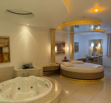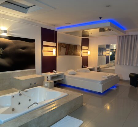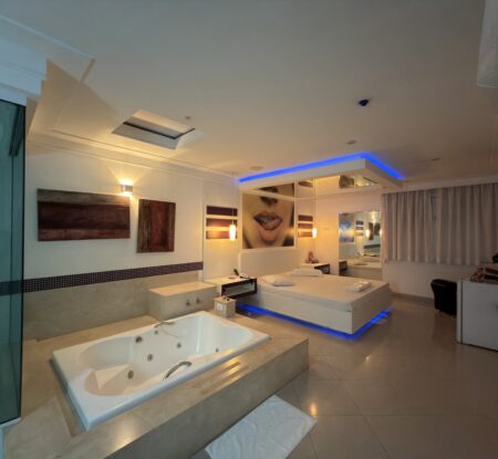 Smart TV 50”, Ar Condicionado Split, Cadeira Erótica, Color Light, Frigobar, Caixa de Som Bluetooth, Hidromassagem e Pista de Dança